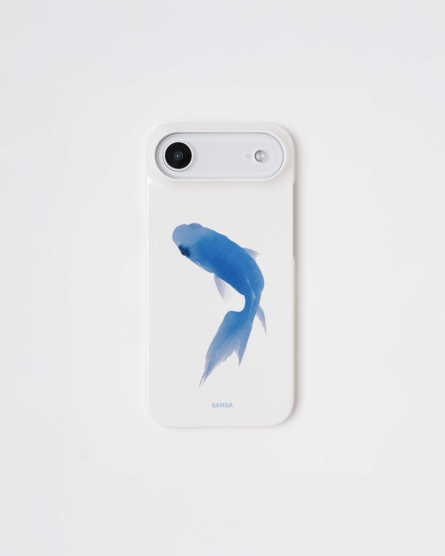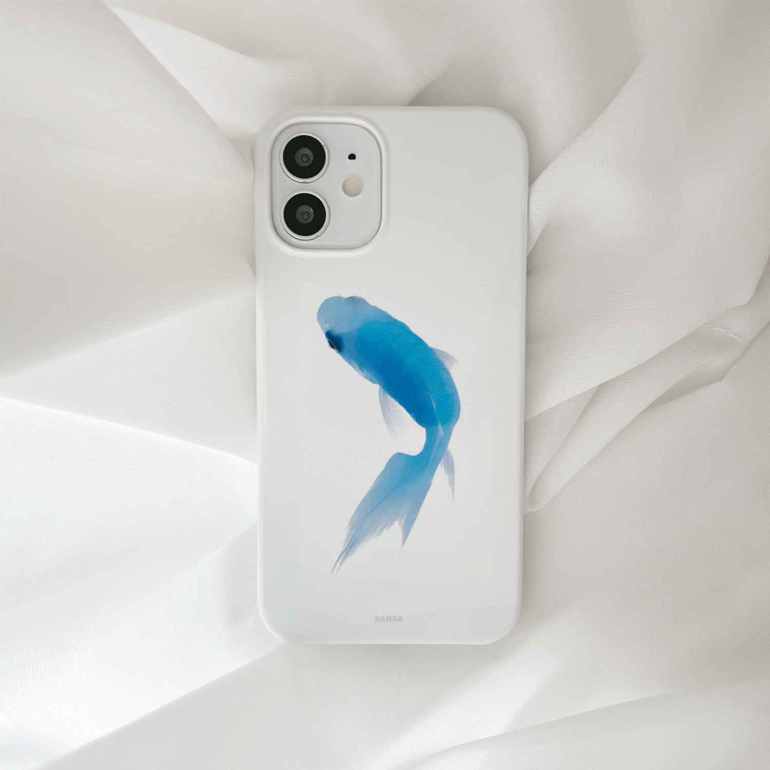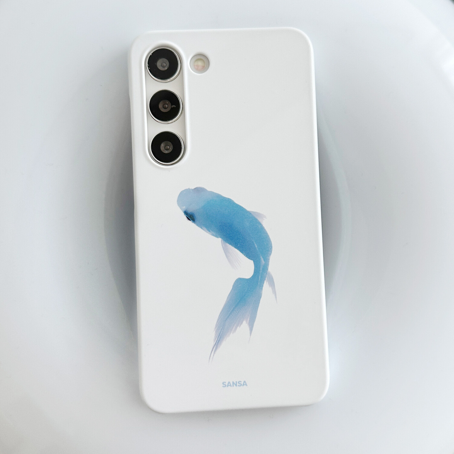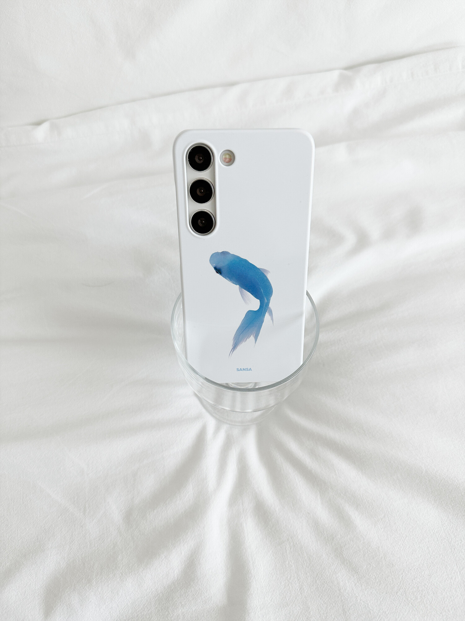 맑은 흰색의 유광 케이스로, 볕을 받았을 때 은은하게 반짝입니다.