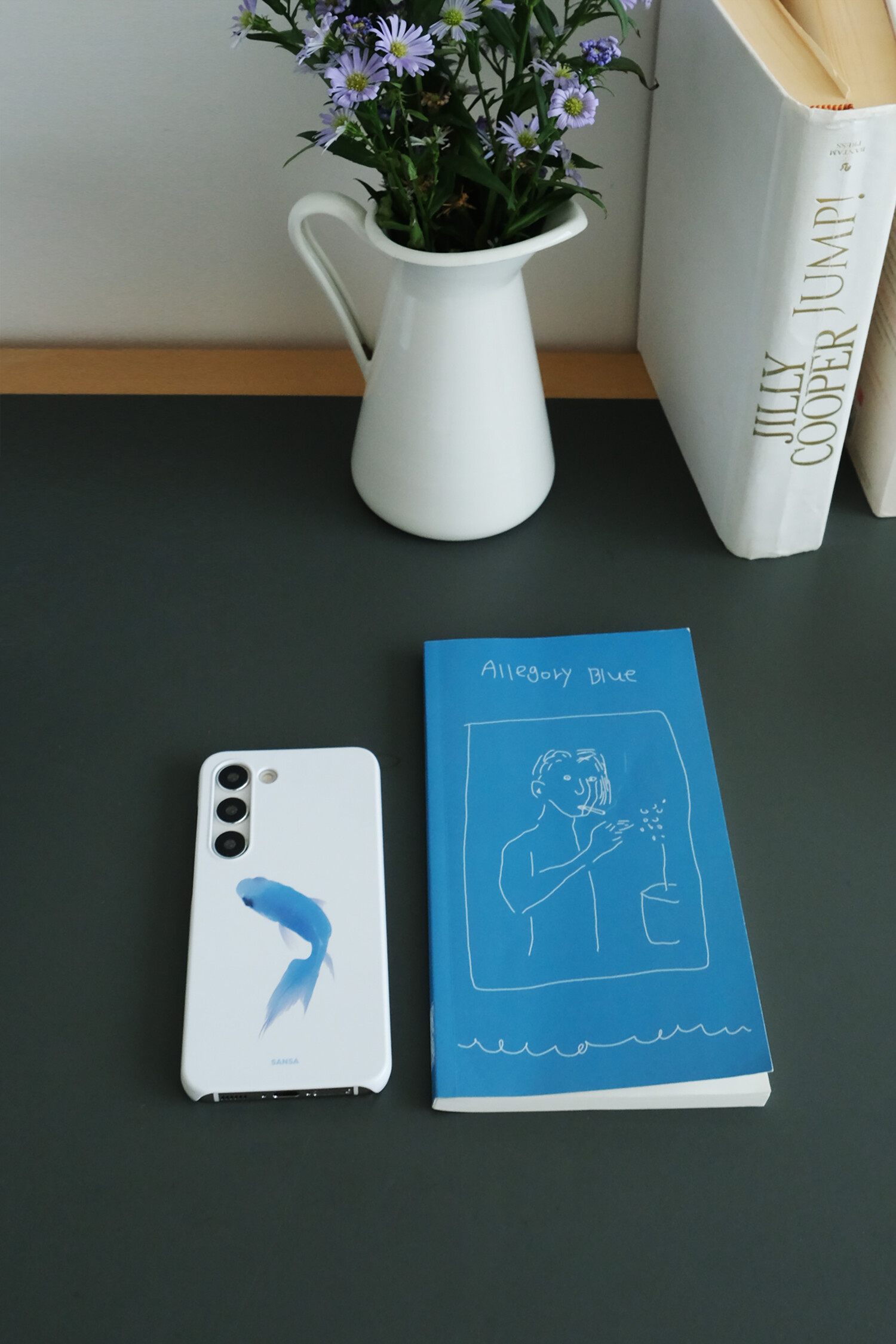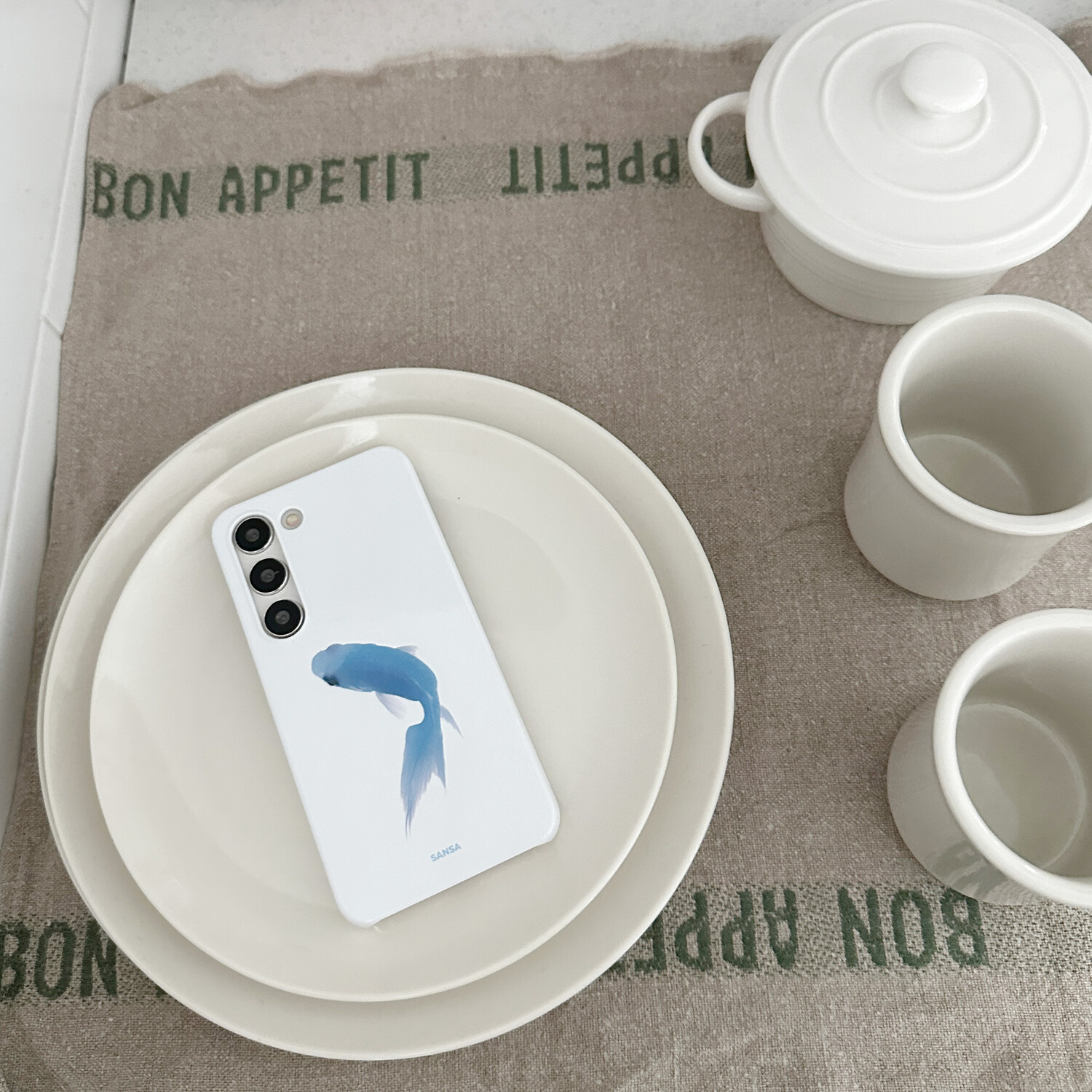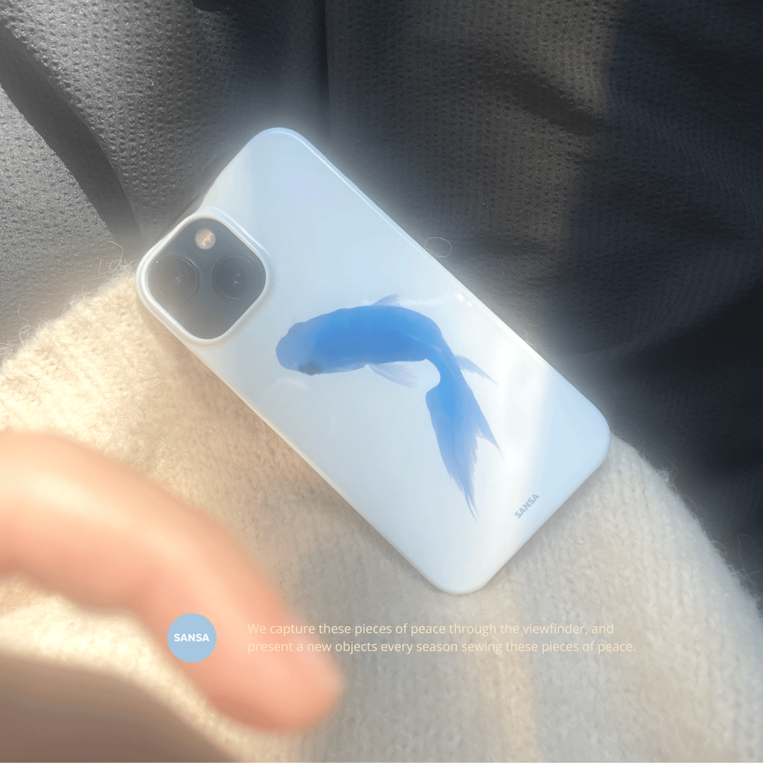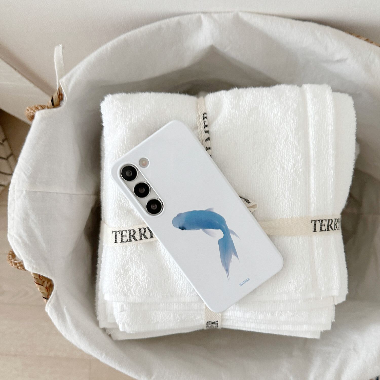 맑은 흰색의 유광 케이스로, 볕을 받았을 때 은은하게 반짝입니다.