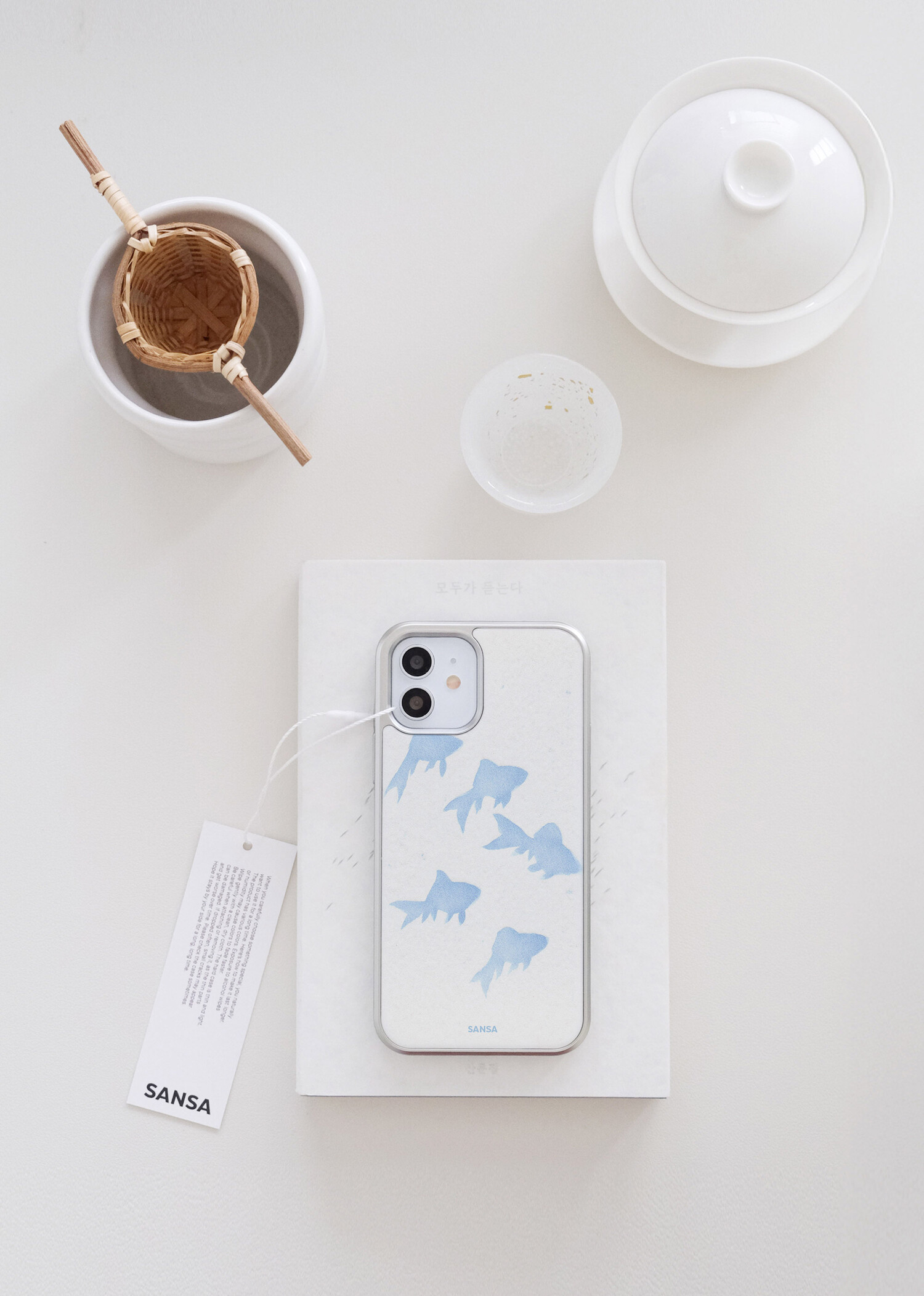 여백 위 그려진 다섯 마리의 푸른 물고기