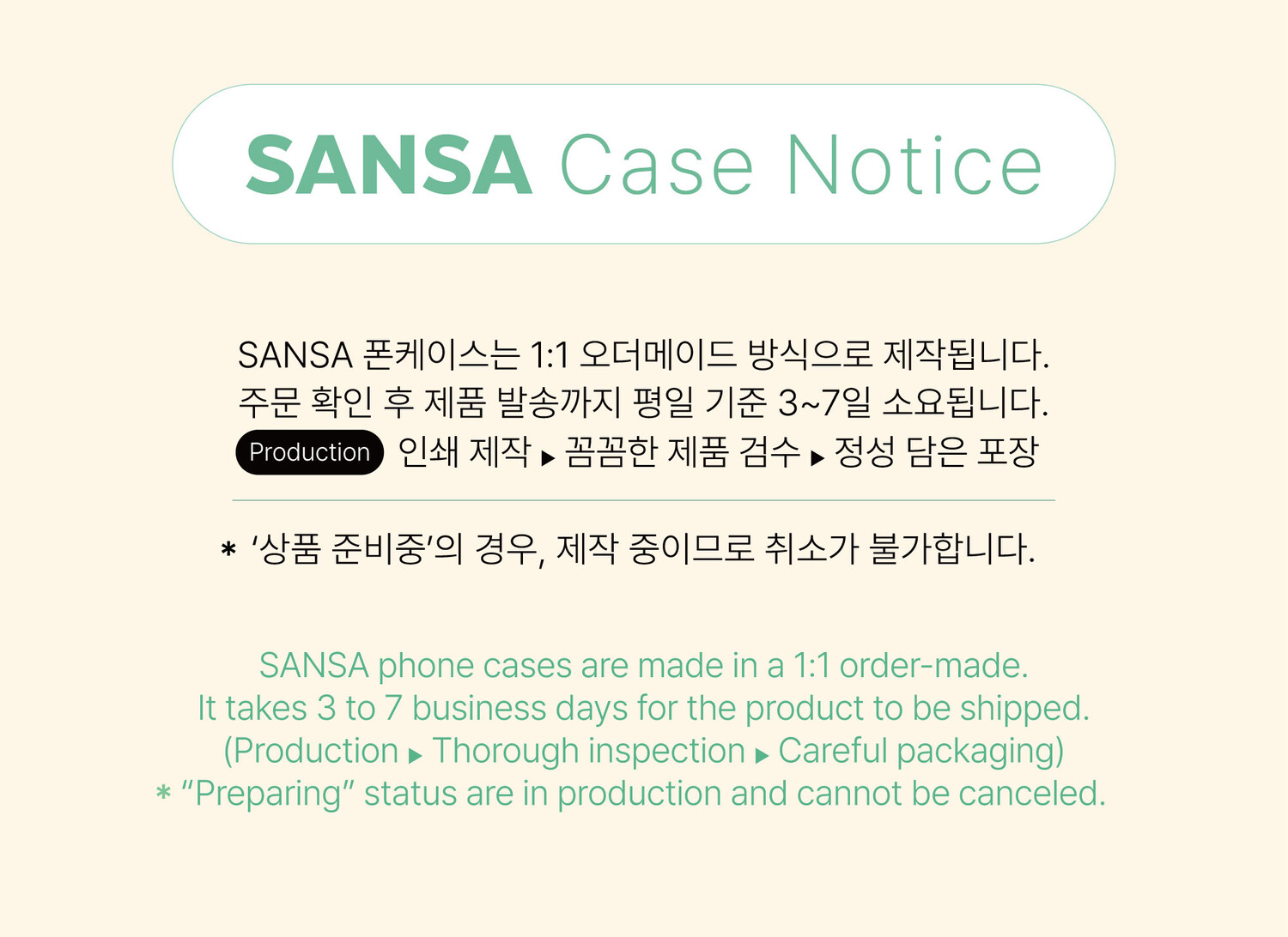 ① 폰케이스 제품은 1:1 주문 제작 형식으로 제작되는 상품이며, 영업일 기준 6-8일 이내 발송 예정입니다.